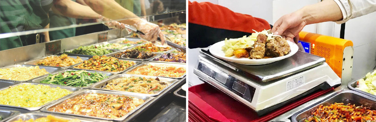 此模式采用稱重計(jì)費(fèi)方式,基本在18元一25元一斤,每餐我公司提供15一20道菜左右,菜品有主葷菜、配葷菜、時(shí)令鮮蔬、鹵菜、粗糧、水果等,分別陳列在我公司設(shè)置的便捷臺上,設(shè)置一邊入口一邊出口走動(dòng)式選菜,這樣既方便了就餐人員選菜同時(shí)也避免了人員來回走動(dòng)造成擁堵。